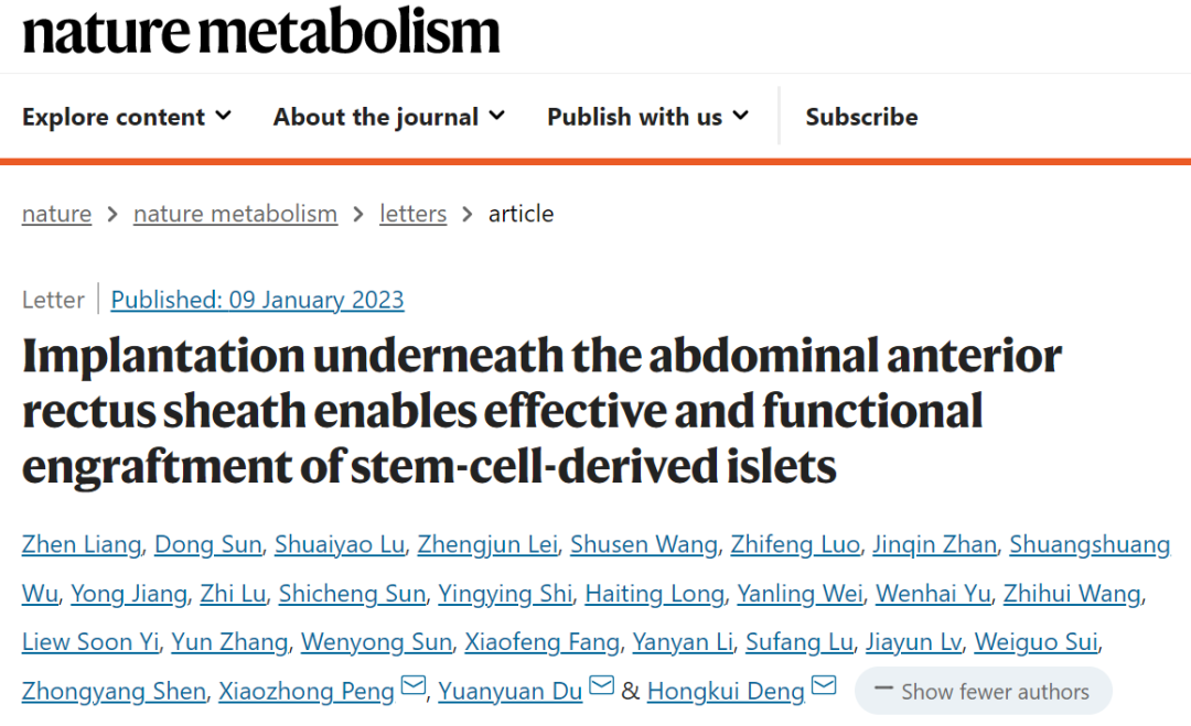 2023年1月9日,北京大學(xué)鄧宏魁研究組、中國醫(yī)學(xué)科學(xué)院/北京協(xié)和醫(yī)學(xué)院彭小忠研究組合作,在Nature Metabolism期刊發(fā)表一項(xiàng)題為:Implantation underneath the abdominal anterior rectus sheath enables effective and functional engraftment of stem cell-derived islets 的研究論文。