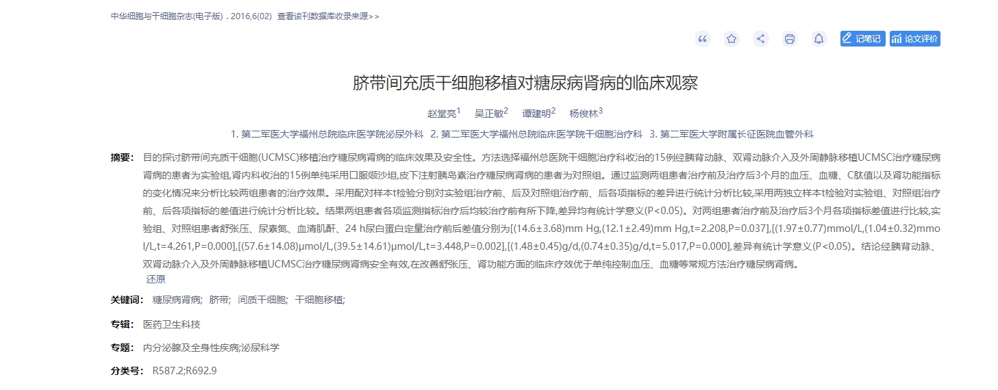 2016年,中華細胞與干細胞雜志發表了一篇臍帶間充質干細胞移植對糖尿病腎病的臨床觀察的論文。