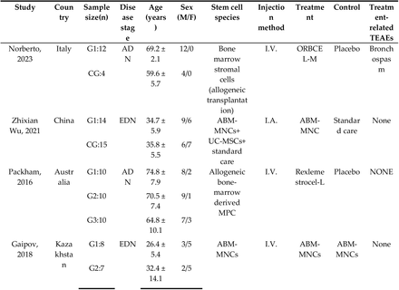 研究特征:基線數(shù)據(jù)和干預(yù)措施列于表1、2中。納入的研究發(fā)表于2016年至2023年之間,共有4篇文章和 90名參與者。共有53名 (58%) 患者接受了SCT。雖然所有納入的研究都應(yīng)用了SCT,但來源、劑量、頻率和注射方式各不相同。所有四項(xiàng)研究均使用骨髓作為干細(xì)胞來源,其中一項(xiàng)研究使用臍帶MSCs。兩項(xiàng)研究采用同種異體給藥,兩項(xiàng)研究采用自體給藥。