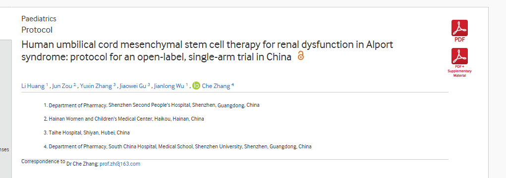 2024年3月15日,深圳二院發布了一篇《人臍帶間充質干細胞治療 Alport 綜合征腎功能障礙:中國開放標簽、單臂試驗方案?》的研究結果。