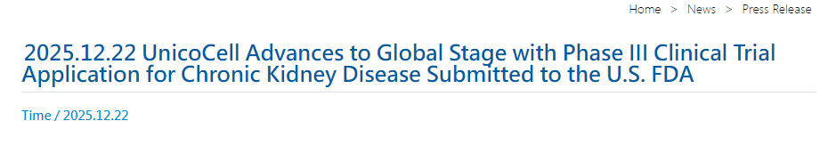 12月22日,UnicoCell Biomed Co., Ltd.宣布,已向美國(guó)食品藥品監(jiān)督管理局(FDA)提交其同種異體脂肪來源間充質(zhì)干細(xì)胞新藥ELIXCYTE?用于治療慢性腎臟?。–KD)的Ⅲ期臨床試驗(yàn)IND申請(qǐng),標(biāo)志著該項(xiàng)目正式邁入全球關(guān)鍵臨床階段。[11]