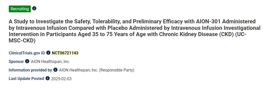 2025年5月19日,美國佛羅里達州邁阿密臨床階段生物技術公司,宣布開始招募針對糖尿病腎病和其他形式的慢性腎病 (CKD,3期) 的首個人體I/II期臨床試驗的患者。[4]
