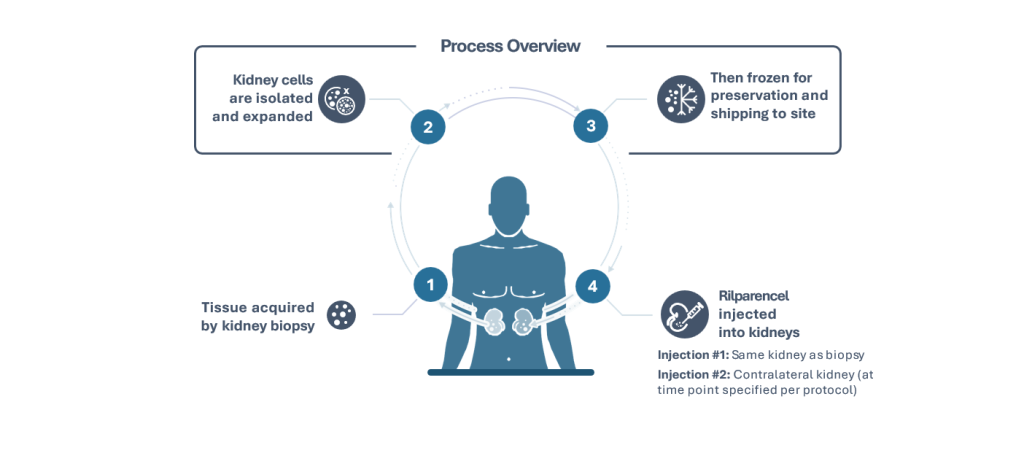 Rilparencel是一種經皮微創注射的自體細胞療法產品,由患者自身的腎臟細胞在體外擴增后制備而成。正是由于其自體來源的特性,患者接受治療后無需終生服用免疫抑制劑來防止排斥反應。