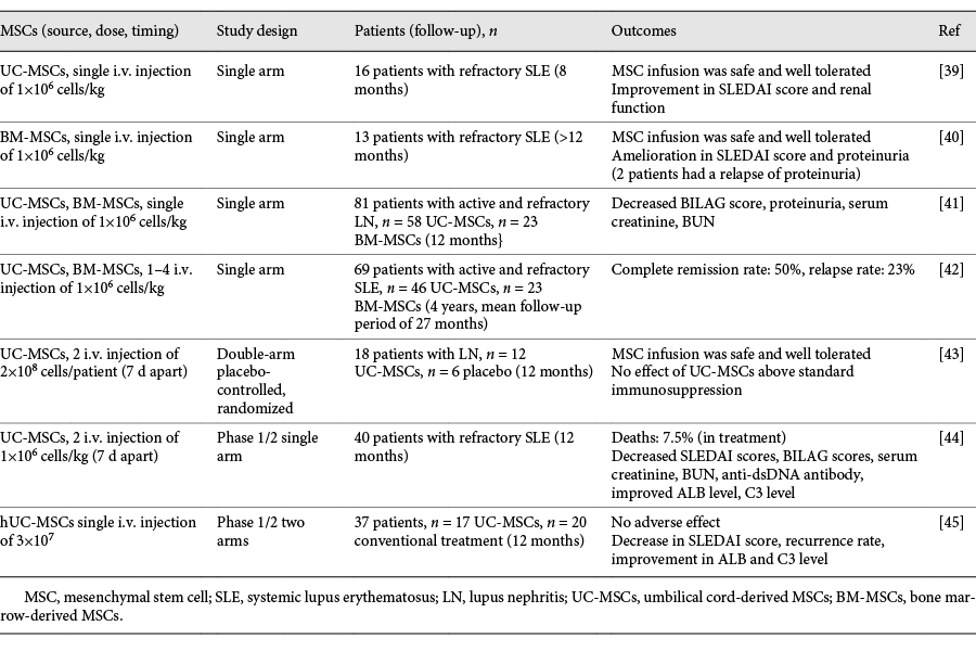 間充質干細胞治療的第一個I期試驗由Lazarus等人進行證明了在15名患者志愿者中進行離體培養擴增和靜脈輸注自體BM-MSC的安全性。從那時起,作為一種預防或治療造血干細胞移植后移植物抗宿主病的新工具,MSC 治療免疫疾病的報道不斷被報道?;趶腗SCs治療狼瘡易發小鼠的那些臨床前研究中收集的令人鼓舞的數據結果,MSC群體已經在LN患者的臨床試驗中進行了測試(表1)。
