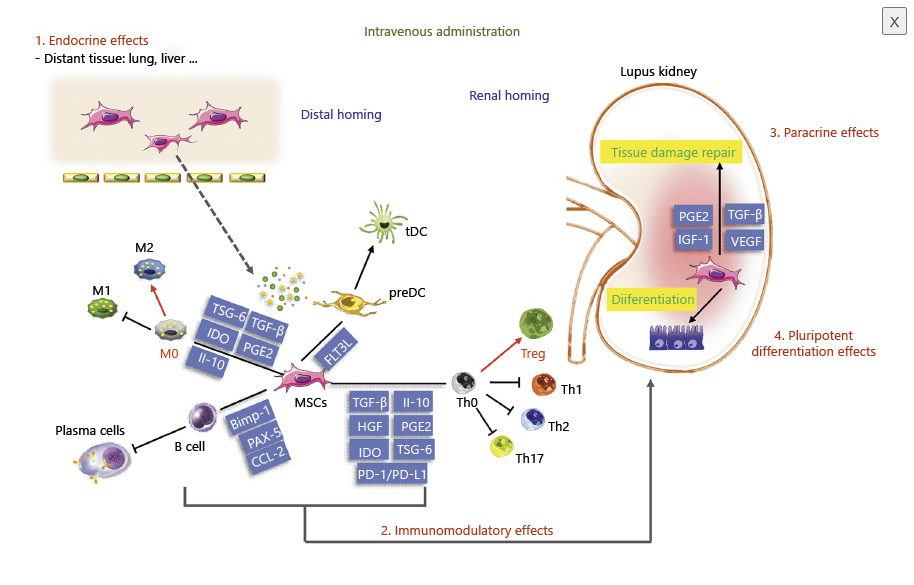 異基因間充質干細胞治療狼瘡腎炎的機制:通過分泌多種可溶性介質,與T細胞、B細胞、巨噬細胞、DC等多種免疫細胞相互作用發揮免疫調節作用;歸巢腎臟后促進修復和再生。