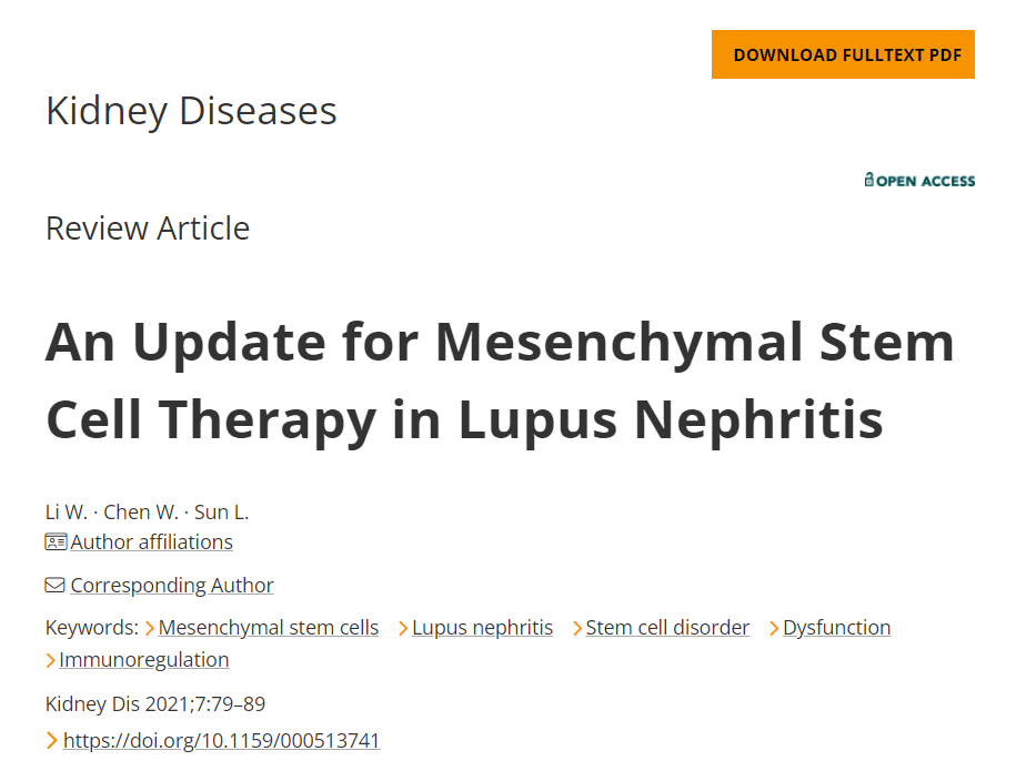 數據顯示所有患者在12至18個月內病情穩定緩解。這些患者表現出疾病活動的改善以及血清學標志物和腎功能的改善,表明異基因BM-MSC移植是治療難治性LN患者的新希望。因此,根據這項臨床研究,我們認為BM-MSC療法對于常規治療耐藥的SLE患者,甚至是LN患者,將是一種可行且安全的挽救療法.