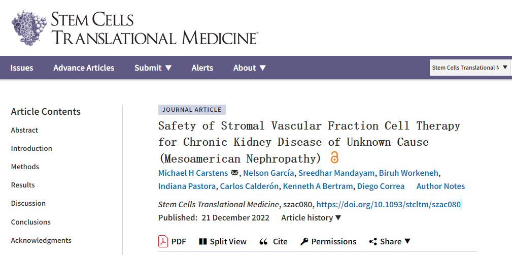 近日,干細(xì)胞轉(zhuǎn)換醫(yī)學(xué)雜志上發(fā)表了一篇關(guān)于《間充質(zhì)干細(xì)胞治療不明原因慢性腎臟病的安全性》的臨床試驗(yàn)綜述,綜述表明在這項(xiàng)首次在人體中進(jìn)行的開(kāi)放標(biāo)簽安全性研究中,在接受單次血管生成/抗纖維化自體脂肪來(lái)源的基質(zhì)血管成分(SVF)輸注后,對(duì)18名CKDu(3-5期)患者進(jìn)行了為期36個(gè)月的隨訪,細(xì)胞通過(guò)腎動(dòng)脈導(dǎo)管插入雙側(cè)腎臟。