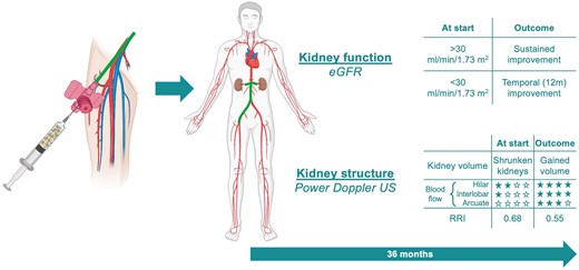 眾所周知,隨著慢性腎臟病的進(jìn)展,腎臟的長(zhǎng)度和體積都會(huì)減少,而CKD中腎臟體積的恢復(fù)異常罕見(jiàn)。因此,我們測(cè)量腎臟體積作為腎臟修復(fù)的一個(gè)替代指標(biāo)。雖然承認(rèn)樣本量小、非盲評(píng)估和單一放射科醫(yī)生作為讀者,但超過(guò)36個(gè)月的超聲研究表明SVF治療后腎臟體積有增加的趨勢(shì)(圖2A)。在12個(gè)月時(shí),與基線相比,共有26/36個(gè)腎臟變大。在36個(gè)月時(shí)(考慮到3名死亡患者),24/30的腎臟仍然大于基線。