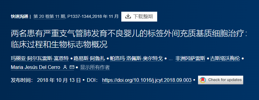 2018年,一項與該試驗相關的案例研究報告稱,在兩名患有嚴重和確診BPD的嬰兒中重復靜脈注射骨髓來源的MSC可導致促炎生物標志物水平降低,而不會發生不良事件。