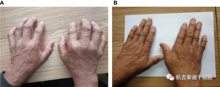 類風(fēng)濕性關(guān)節(jié)炎的干細(xì)胞療法綜述源自黃的研究。一名68歲男性于1998年被診斷出患有RA。( A )顯示患者的雙手無法保持伸直。(二)治療后三年,已停止使用抗風(fēng)濕藥五年,雙手伸展自如,關(guān)節(jié)周圍的風(fēng)濕結(jié)節(jié)逐漸變軟、消退。(3)
