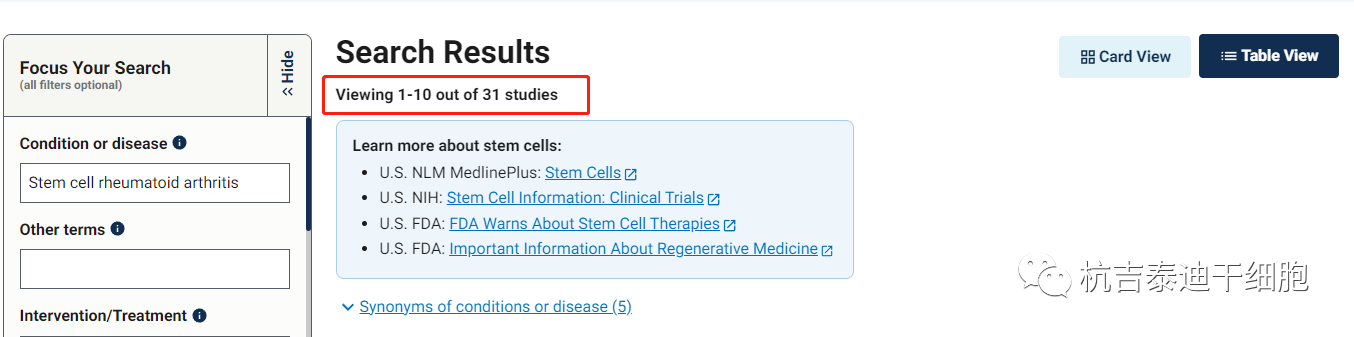 截止2023年6月,在美國國立衛(wèi)生研究院的最大臨床試驗注冊庫clinicaltrials.gov網(wǎng)站上注冊的有關(guān)干細(xì)胞治療類風(fēng)濕關(guān)節(jié)炎的臨床研究項目有31項。