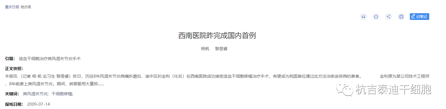 2009年,西南醫(yī)院完成了國內(nèi)首例造血干細(xì)胞移植治療類風(fēng)濕關(guān)節(jié)炎的臨床試驗。