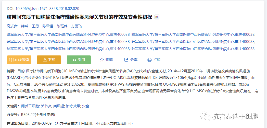 2018年,陸軍軍醫(yī)大學(xué)/第三軍醫(yī)大學(xué)西南醫(yī)院中西醫(yī)結(jié)合科進(jìn)行了臍帶間充質(zhì)干細(xì)胞輸注治療難治性類風(fēng)濕關(guān)節(jié)炎的療效及安全性初探。