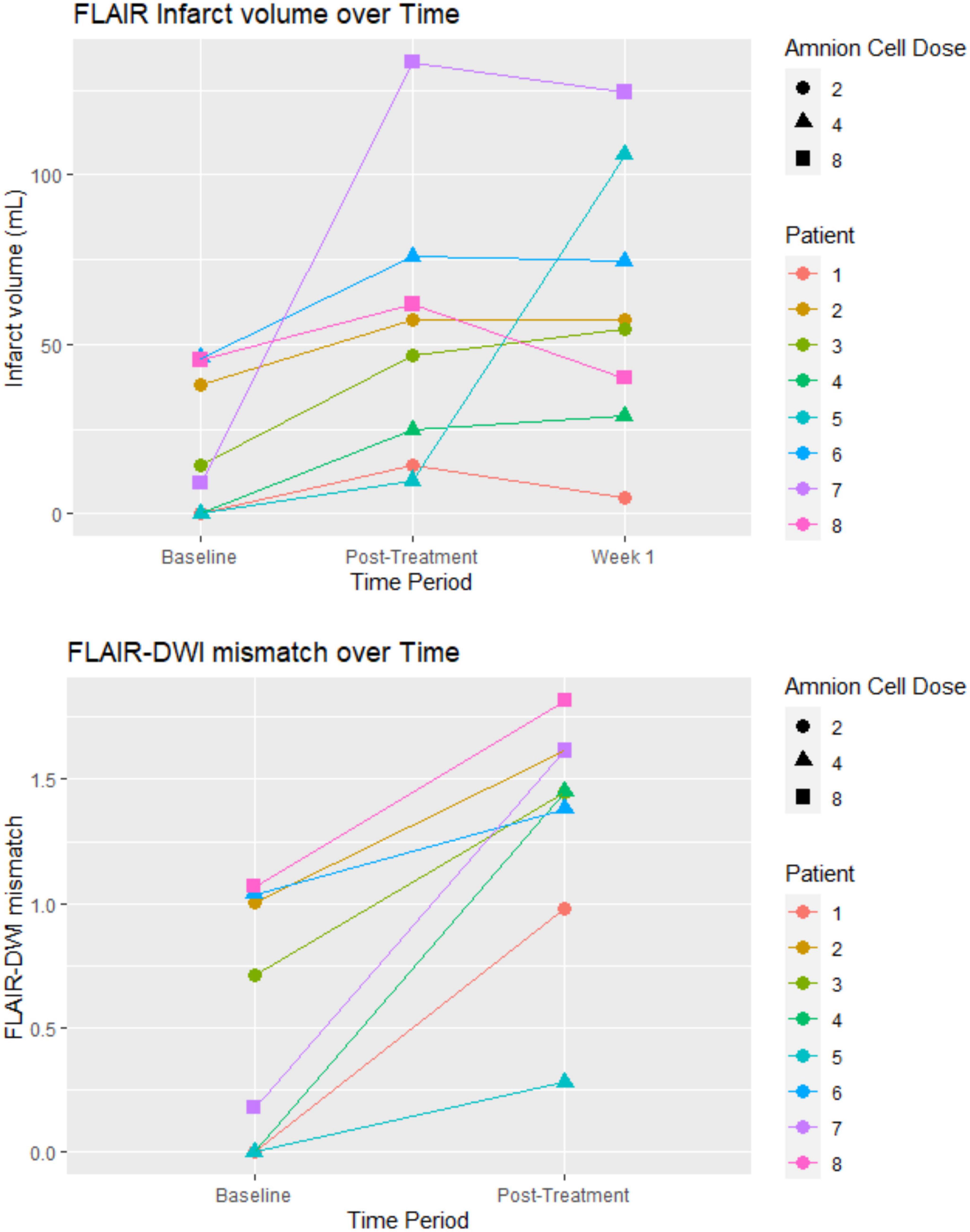 結果:8名患者(6名男性)在缺血性中風發作24小時內被招募,并接受hAEC輸注。我們能夠將hAEC的劑量增加至8×10^6個細胞/kg(2×10^6/kg,n=3;4×10^6/kg,n=3;8×10^6/kg,n=2)。平均年齡為68.0±10.9(平均值±標準差)。高血壓、高脂血癥的發生率為87.5%,糖尿病為37.5%,房顫為50%,缺血性心臟病為37.5%,曾經吸煙者為25%。