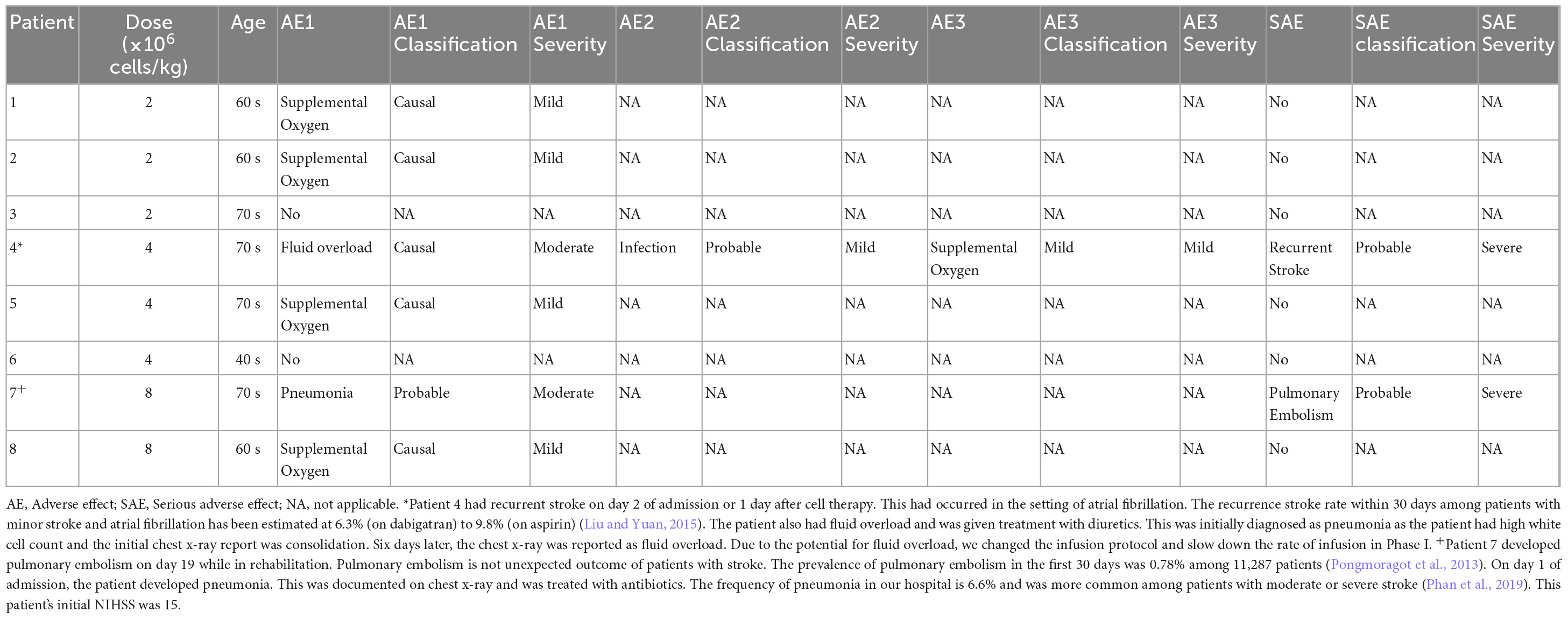 總體而言,基線NIHSS為7.5±3.1,24小時時為7.8±7.2,1周時為4.9±5.4(n=8)。90天時的改良Rankin量表為2.1±1.2。在hAEC輸注期間,五名患者接受了補充氧氣。使用預先定義的標準,發生了兩起嚴重的不良事件。一名患者在康復期間出現復發性中風,另一名患者出現肺栓塞。對于最后四名患者,hAEC的輸注在隨后的幾天中分次進行,以降低液體超負荷的風險。