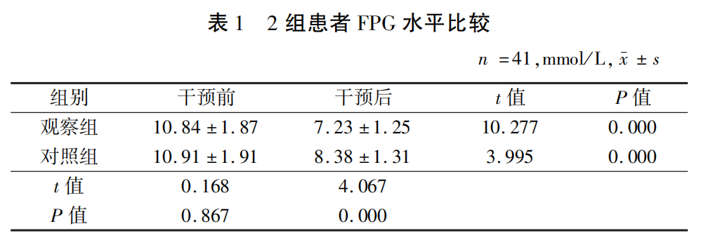 2組患者FPG水平比較:干預前,2組FPG水平差異無統計學意義(P>0. 05);干預后,2組FPG水平明顯降低(P<0.05),且與對照組比較,觀察組降低更明顯(P<0.05)。見表1。