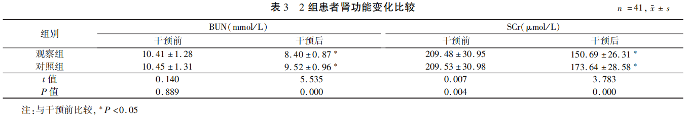 2組患者腎功能比較:治療前,2組患者的BUN、SCr水平差異無統計學意義(P>0.05);治療后,2組BUN、SCr水平明顯降低(P<0.05),與對照組比較,觀察組的BUN、SCr降低更明顯,差異有統計學意義(P<0.05)。見表3。