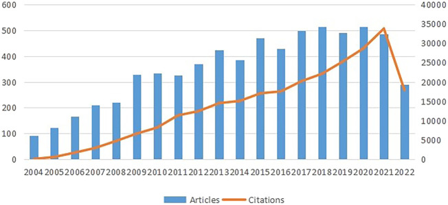 可以看出圖2,直方圖和曲線展示了兩個趨勢:每年發表的論文總數和引用次數。這兩種趨勢隨著時間的推移而增長,說明了該領域研究的發展方向。2004年至2021年間,引用次數顯著且迅速增加,表明干細胞在中風中的研究引起了人們的興趣。2004年至2007年,文獻數量快速增長,2009年更是大幅增長。不過,2010年至2017年的文章數量保持相對穩定2020年是近年來發表數量最多的一年,峰值為515篇。雖然2022年的數據尚未完成,但預計將呈現出與上年相比,呈溫和趨勢。