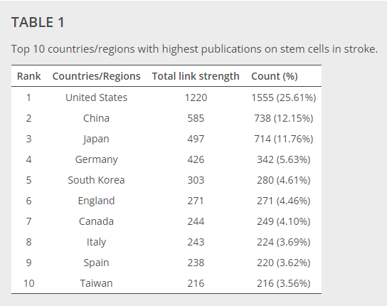 參考資料:Zhang Q, Zeng Y, Zheng S, et al. Research hotspots and frotiers of stem cells in stroke: A bibliometric analysis from 2004 to 2022. Frontiers in Pharmacology. 2023 ;14:1111815. DOI: 10.3389/fphar.2023.1111815. PMID: 36937837; PMCID: PMC10020355.
