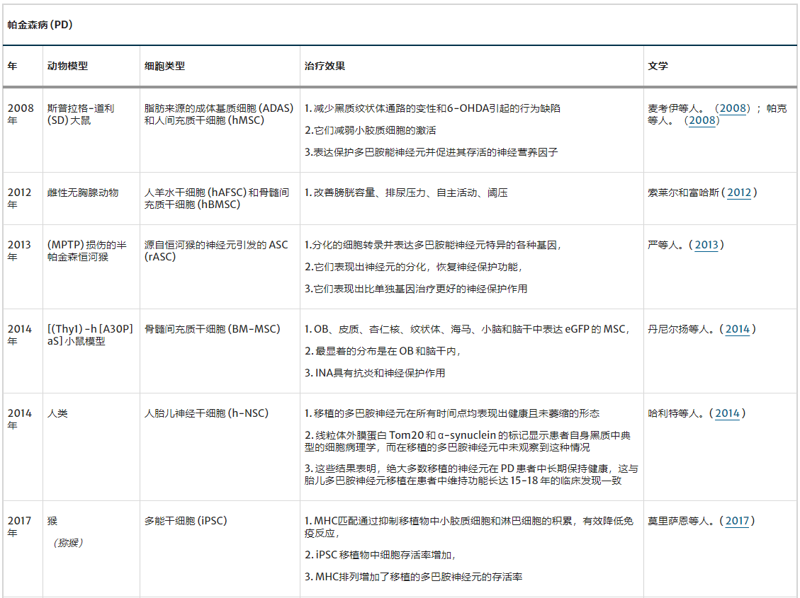 結論:積極的結果使我們可以考慮將間充質干細胞移植作為帕金森病的一種疾病緩解治療策略。然而,這種PD治療方法并不是一個完全被理解的過程,這需要額外的研究和更長的隨訪期來監測患者移植后的狀況。