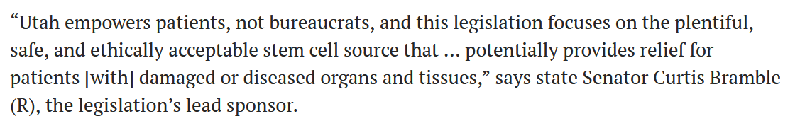 猶他州參議員Curtis Bramble (R)是這項法案的主要發(fā)起人,他表示:猶他州將權利下放到患者本人,而非政府工作人員,法案通過的是豐富的、安全的、倫理可接受來源的干細胞,能夠為組織器官受損的患者提供治療。