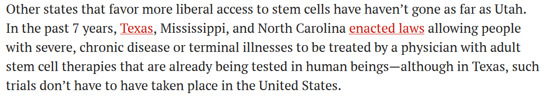在過去7年,德克薩斯州、密西西比州和北卡羅來納州頒布了法律,允許患有嚴重、慢性疾病或晚期疾病的患者由醫(yī)生使用成人干細胞療法進行治療,這種療法已經(jīng)在人體中進行了測試,但這種試驗不需要在全美國進行。