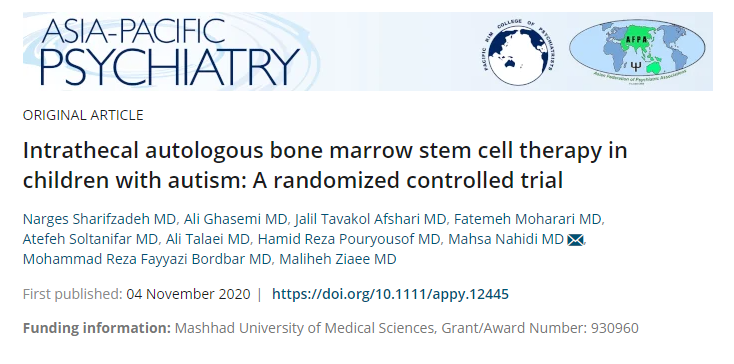近年來,馬什哈德醫科大學在《Wiley Online Library》雜志上發布了一篇《自閉癥兒童鞘內自體骨髓干細胞治療:一項隨機對照試驗》,結果顯示鞘內注射自體骨髓間充質干細胞似乎是安全可行的,但在治療兒童自閉癥方面的臨床療效有限。
