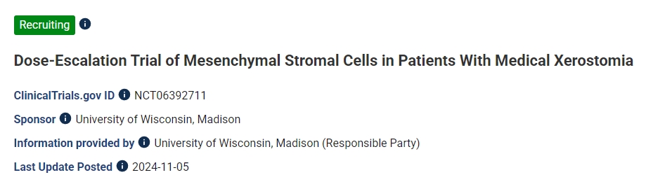 其劑量遞增步驟將招募多達18名患者。第一組將向兩個頜下腺分別注入1000萬個間充質基質細胞。如果耐受性良好,隨后接受治療的患者將向每個腺體注入更高劑量的2000萬個間充質基質細胞。然后,將在擴展步驟中使用最高安全劑量,對12名患者進行治療。