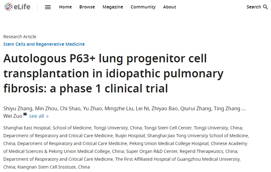 參考資料:[1]:Shiyu Zhang, Min Zhou, Chi Shao, Yu Zhao, Mingzhe Liu, Lei Ni, Zhiyao Bao, Qiurui Zhang, Ting Zhang, Qun Luo, Jieming Qu, Zuojun Xu, Wei Zuo (2025) Autologous P63+ lung progenitor cell transplantation in idiopathic pulmonary fibrosis: a phase 1 clinical trial eLife 13:RP102451.https://doi.org/10.7554/eLife.102451.3