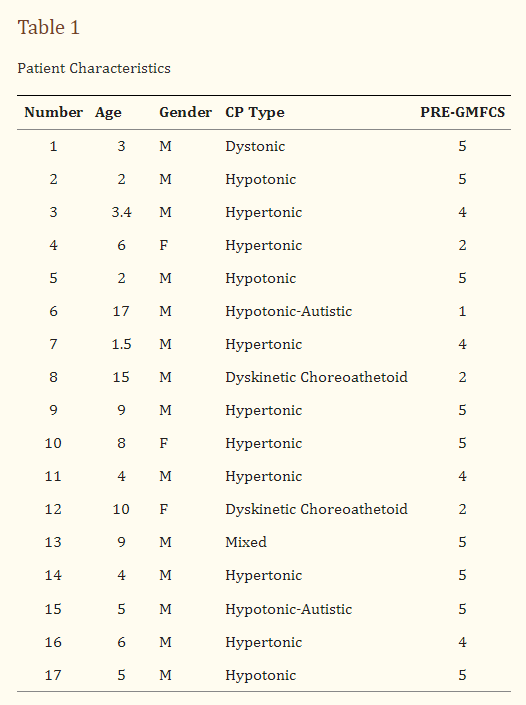 本研究共納入17名年齡在1.5至17歲的CP患者,運(yùn)動(dòng)功能為低張力5例(29%),高張力8例(47%),運(yùn)動(dòng)障礙2例(11.7%),伴有舞蹈手足徐動(dòng)癥,1例患者有肌張力障礙,一例為混合型。可以分析所有患者數(shù)據(jù)的安全性。平均年齡為6.5歲,中位數(shù)為6歲。大多數(shù)為男性(17人中有14人,即82%),女性為17人中的3人(18%)。表格1總結(jié)了這些患者的人口統(tǒng)計(jì)數(shù)據(jù)。