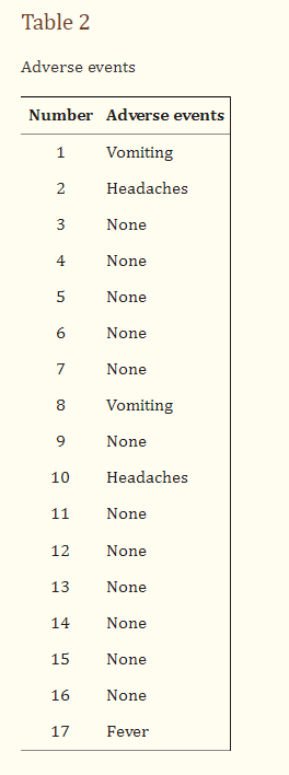 報(bào)告的不良事件(表2) 僅限于輕度頭痛(2或12%)、短暫發(fā)熱(1或6%)或嘔吐(2或12%),或沒(méi)有任何不良事件報(bào)告(12或70%)。所有的副作用都在幾天內(nèi)解決了。沒(méi)有注意到癲癇發(fā)作、情緒激動(dòng)、腦膜炎、注射部位疼痛或其他嚴(yán)重事件的報(bào)告。