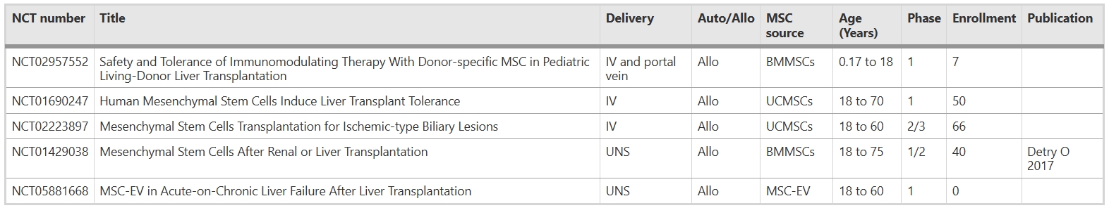 總體而言,五項基于同種異體MSC的試驗(包括兩項BMMSC、兩項UCMSC和一項EV試驗)針對肝移植并發癥。此外,在另一個平臺chictr.org.tw上注冊為ChiCTR2000037732的臨床試驗的結果表明,同種異體UCMSC在預防ABO血型不合肝移植中抗體介導的排斥反應方面與利妥昔單抗治療相當。
