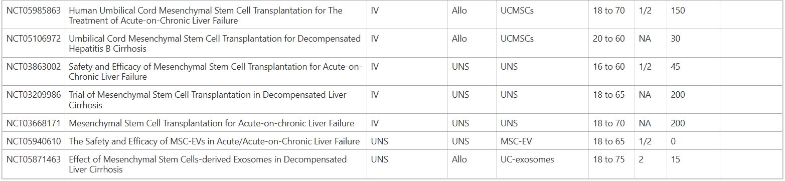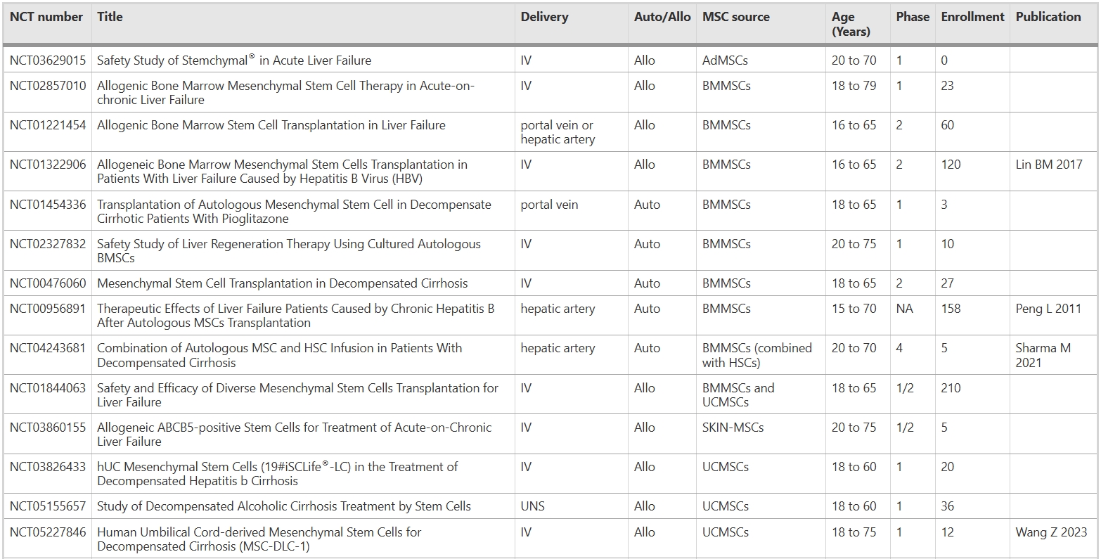 MSC療法因其免疫調節和再生特性,是治療ACLF以及慢性或急性肝衰竭的一種有前景的策略。迄今為止,已有34項臨床試驗正在研究基于 MSC的療法,其中兩項試驗利用無細胞產品,用于治療肝衰竭或肝失代償(表5)。