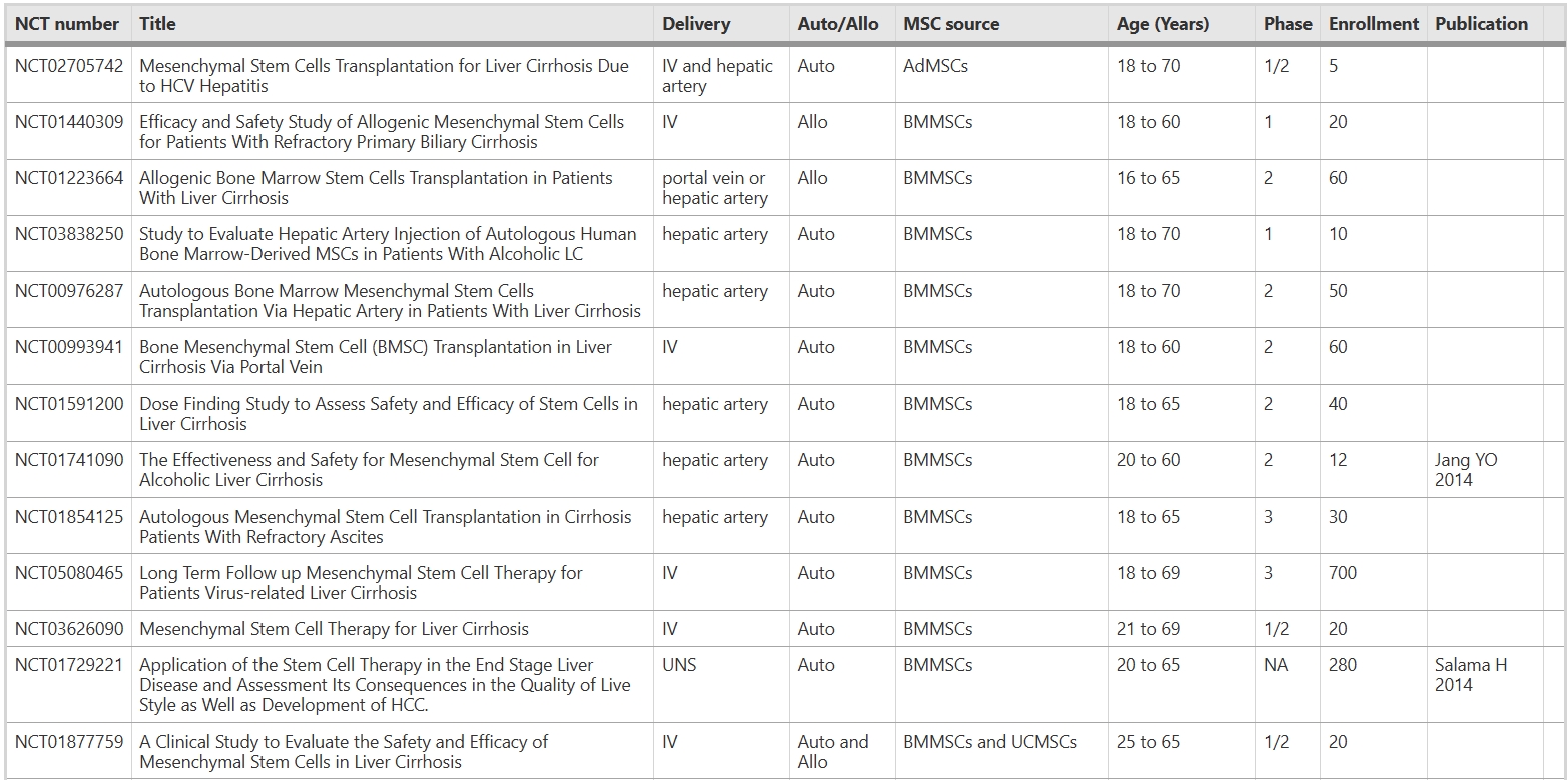 目前,肝移植是治療肝硬化的少數有效方法之一,但它面臨著諸多挑戰,包括供體短缺、手術并發癥、移植排斥和高昂的費用。為了應對這些挑戰,MSC療法應運而生,成為一種可選的治療方法。目前有31項臨床試驗正在研究MSC治療肝硬化(表4)。