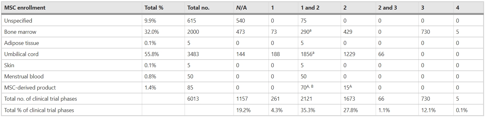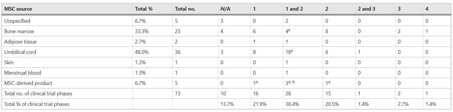 圖中顯示了使用不同來源人類MSC的試驗數量,分類為自體MSC(AUTO-MSC)、同種異體MSC(ALLO-MSC)、來源不明的MSC(UNSP-MSC)和/或細胞外囊泡(EVs)/外泌體(MSC衍生產品)。