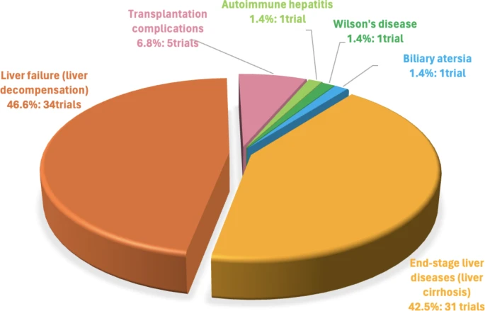 截至2024年8月,共有73項涉及MSC治療肝病的臨床研究已在美國國立衛生研究院臨床試驗數據庫 (https://ClinicalTrials.gov/) 上注冊。這些試驗主要關注終末期肝病或肝硬化(31項試驗)和肝功能衰竭或失代償(34項試驗),針對其他肝病的試驗較少,包括移植并發癥(5項試驗),以及針對自身免疫性肝炎、威爾遜氏病和膽道閉鎖的單項試驗(圖2)。
