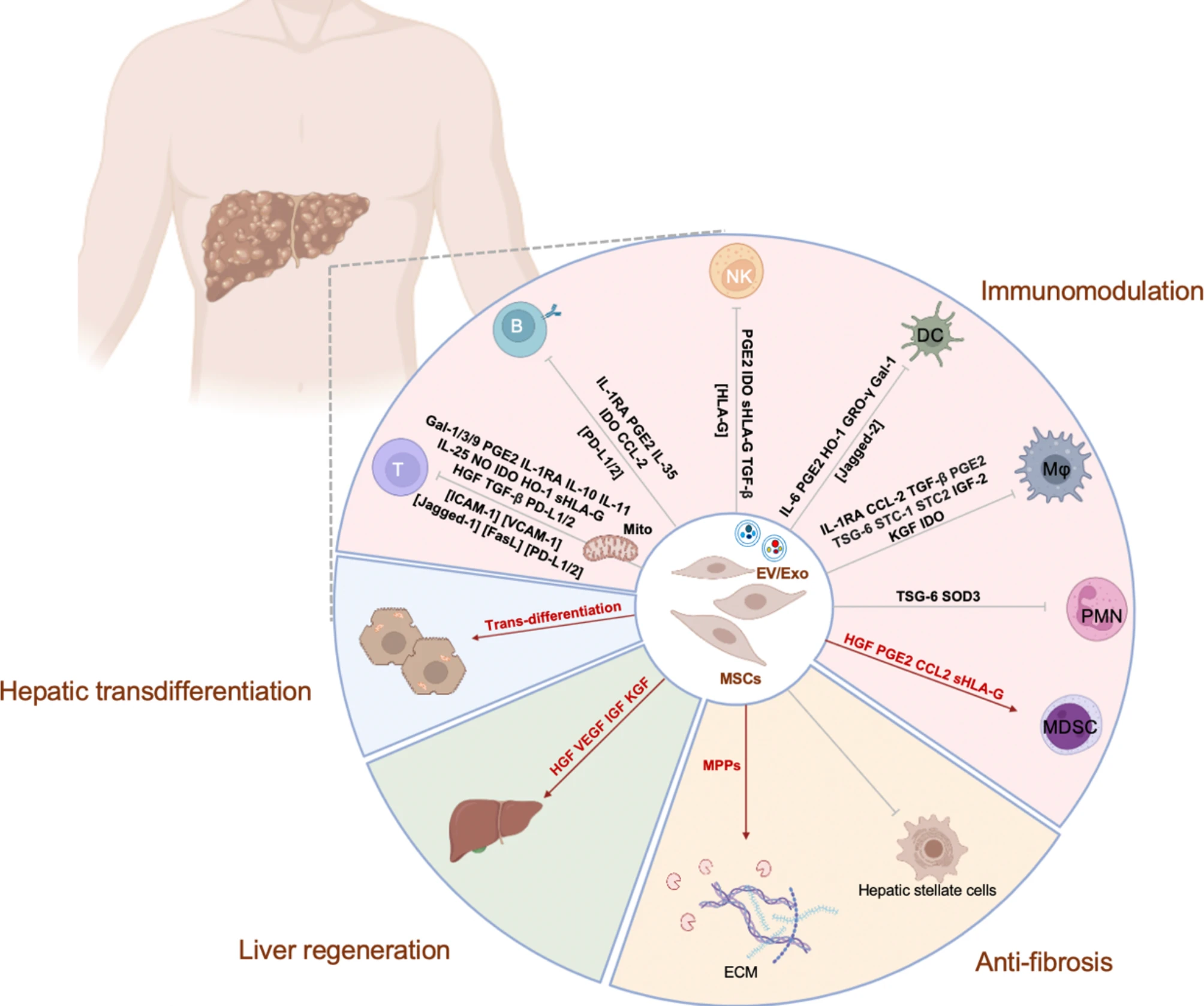 MSCs因其獨特的生物學特性,包括能夠分化成多種細胞類型、調節免疫反應和促進組織修復,已成為治療肝病的一種有前景的治療選擇。MSCs在肝病治療中的潛力在于其能夠治療多種病理過程,包括炎癥、纖維化和肝細胞丟失,而這些病理過程是許多肝臟疾病進展的關鍵。