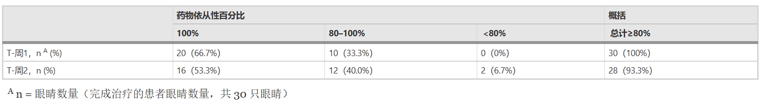 我們通過(guò)計(jì)算實(shí)際用藥頻率占預(yù)期用藥頻率的百分比來(lái)評(píng)估患者的用藥依從性。我們發(fā)現(xiàn),93.3%的患者在治療期結(jié)束時(shí)(T周2)的依從性超過(guò)80%,表明患者的依從性令人滿(mǎn)意(表1)。