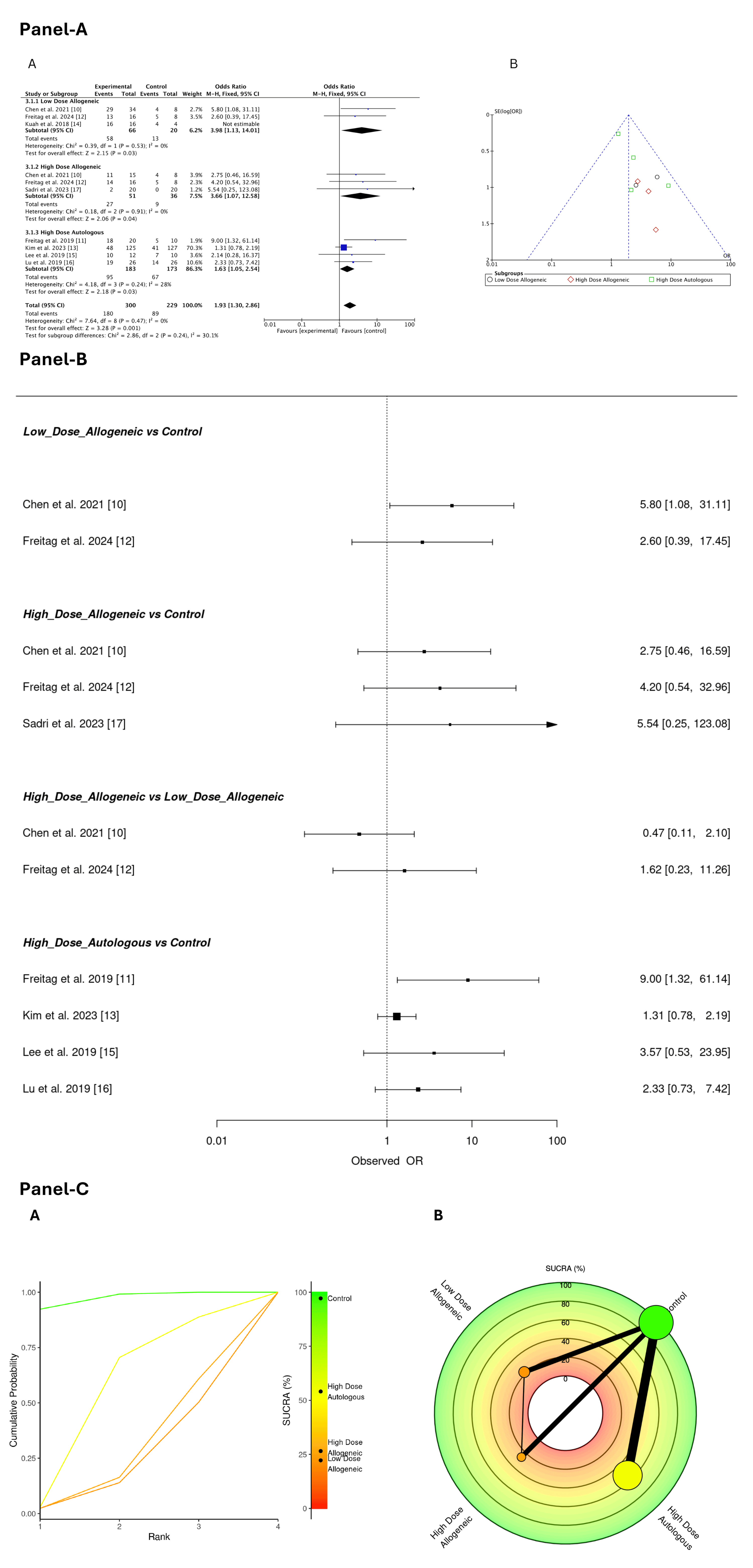 低劑量異基因AD-MSCs在不同研究中效果不一,部分研究置信區間寬泛,顯示治療反應差異;高劑量異基因 AD-MSCs 在 Sadri 等(2023年)研究中表現突出,但其他研究效應較小且置信區間重疊。高劑量自體 AD-MSCs 在 Lee 等(2019 年)和 Freitag 等(2019年)研究中顯示顯著改善,但Lu等(2019年)研究因置信區間跨過零,提示療效變異性。高劑量與低劑量異基因組的直接比較未顯示明確優勢(置信區間重疊)。
