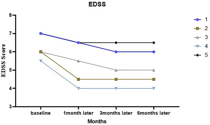次要結果:次要結果側重于臨床癥狀、認知和心理問題的改善,以及全身炎癥和B細胞CD20/CD19標記物的減少。所有患者均通過臨床訪視進行監測,并由神經科醫生使用EDSS評估其臨床狀況,并在注射后0、1、3和6個月記錄測量值。