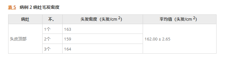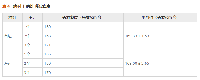 治療四年后,患者在先前AA損傷部位的平均毛發密度為169.33根頭發/cm2(右側損傷)和 168.00 根頭發/cm2(左側損傷)(表4)。