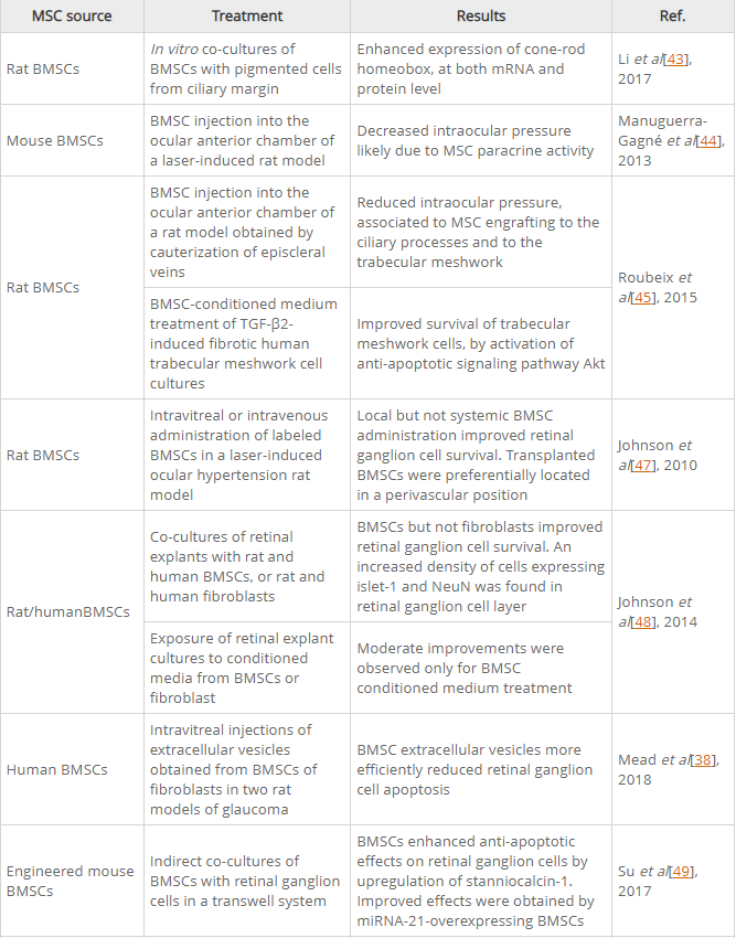 在基于MSC的治療后獲得的結果總結在表2中。它們中的大多數表明RGC存活率提高、功能性RGC樣細胞的產生以及成熟RGC中常駐視網膜干細胞的擴增和分化。盡管玻璃體內給藥通常會產生少量的MSC植入和視網膜分化,但有益效果也歸因于MSC釋放的神經營養因子。