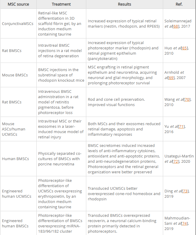 許多實驗數據都在體外獲得研究和動物模型報告了令人鼓舞的結果,盡管在移植后,只有有限部分的注射細胞真正植入并分化為功能細胞。由于廣泛的MSC旁分泌活動,無細胞治療也已被探索并產生積極效果。還對間充質干細胞進行了基因操作,以提高它們歸巢到受損部位的能力,以及過度表達有助于視網膜修復的細胞因子/生長因子。許多臨床試驗已經進行,盡管有一些不利影響,但據報道有希望的結果。