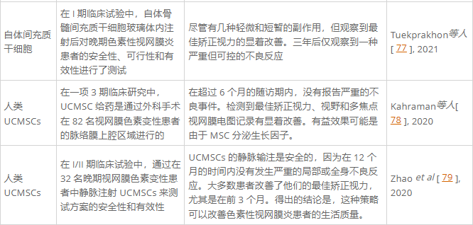 在I/II期臨床試驗中,對32名晚期RP患者進行了臍帶間充質干細胞靜脈內給藥,以評估安全性和有效性方案。單劑量注射后,對所有受試者進行為期12個月的隨訪。結果表明,臍帶間充質干細胞的靜脈輸注是安全的,因為沒有發生嚴重的局部或全身不良反應。大多數患者改善了他們的BCVA,尤其是在前3個月。結論是靜脈輸注臍帶間充質干細胞可以改善晚期RP患者的生活質量。