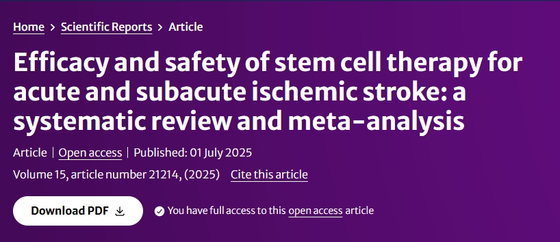 2025年。7月2號,國際權威期刊雜志《Nature》子刊“scientific reports”發表了一篇“干細胞治療急性和亞急性缺血性中風的療效和安全性:系統評價和薈萃分析”系統性綜述。