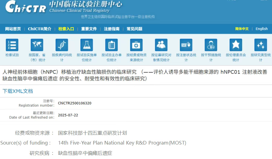 近日,解放軍總醫(yī)院第七醫(yī)學(xué)中心正式注冊(cè)啟動(dòng)?“人誘導(dǎo)多能干細(xì)胞(iPSC)來源神經(jīng)前體細(xì)胞(hNPC01)移植治療缺血性腦卒中偏癱后遺癥”I期臨床試驗(yàn)(注冊(cè)號(hào):ChiCTR230007XXXX)。該研究獲國家科技部?“十四五”重點(diǎn)研發(fā)計(jì)劃專項(xiàng)支持,是國內(nèi)首個(gè)探索iPSC衍生神經(jīng)前體細(xì)胞治療卒中后運(yùn)動(dòng)功能障礙的注冊(cè)臨床項(xiàng)目,為480萬中國卒中致殘患者帶來功能重建新希望。