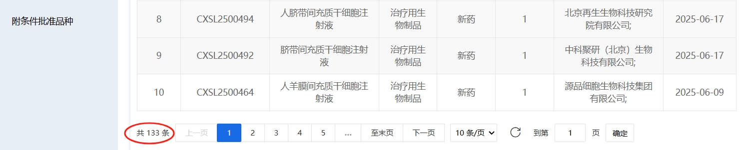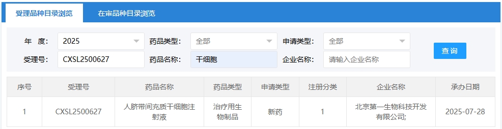 新增受理10:2025年07月28號,北京第一生物科技開發有限公司申報的“人臍帶間充質干細胞注射液”的臨床試驗獲受理(受理號:CXSL2500627),這是該款細胞注射液第1次獲得受理。