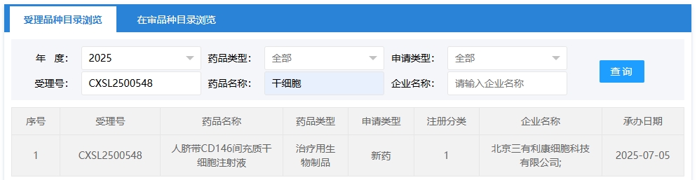 新增受理6:2025年07月05號,北京三有利康細胞科技有限公司申報的“人臍帶CD146間充質干細胞注射液”的臨床試驗申請獲受理(受理號:CXSL2500548),這是該款細胞注射液第1次獲得受理。