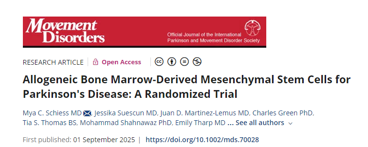 [3]Schiess, M.C., Suescun, J., Martinez-Lemus, J.D., Green, C., Thomas, T.S., Shahnawaz, M., Tharp, E., Satani, N.B., Saltarrelli, J.G., Adams, C., Doursout, M.-F., Thyne, V., Abuamouneh, R., Rodarte, E.M., Savitz, S.I. and Ellmore, T.M. (2025), Allogeneic Bone Marrow-Derived Mesenchymal Stem Cells for Parkinson’s Disease: A Randomized Trial. Mov Disord.?https://doi.org/10.1002/mds.70028