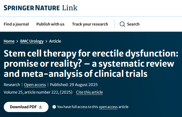 參考資料:[1]:Senel, S., Sevinc, A.H., Gultekin, H.?et al.?Stem cell therapy for erectile dysfunction: promise or reality? – a systematic review and meta-analysis of clinical trials.?BMC Urol?25, 222 (2025). https://doi.org/10.1186/s12894-025-01913-5